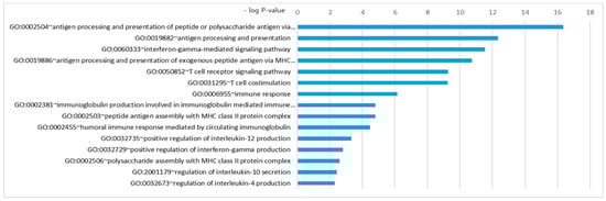 To investigate disease pathways, gene ontology (GO) enrichment analysis was performed. Several GO terms enriched in the SNPs set were identified by GO enrichment analysis for each subtype. Immune-related GO terms, including “antigen processing and presentation of peptide or polysaccharide antigen via MHC class II” (GO:0002504) with a p-value of 4.4 × 10−17, “interferon-gamma-mediated (IFN-γ) signaling pathway” (GO:0060333) with a p-value of 2.9 × 10−12, and “T cell receptor signaling pathway” (GO:0050852) with a p-value of 5.5 × 10−10, were identified as the most prominently enriched AAV-related gene sets (Figure 4 and Figure S3)
