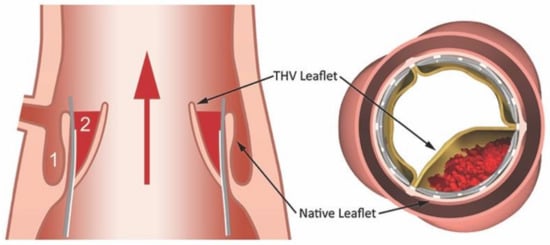 The mechanisms underlying thrombosis associated with TAVI are likely multifactorial. In this regard, a number of contributing factors potentially explaining the thrombotic risk associated with TAVI have been proposed. These include: (1) flow disturbances associated with prosthetic valve placement, (2) the introduction of a prothrombotic metallic frame, and (3) a co-existent prothrombotic tendency in an older, co-morbid population [22,23,24]. Emerging evidence suggests that the haemodynamic disturbances created at sites of valve implantation play a leading role in thrombus formation [22,23,24,25,26]. Indeed, clinical data has demonstrated that the majority of thrombi forming around TAVIs occur on the aortic side of the implanted valve, between the leaflet and stent. This is significant since deployment of the stent and bioprostethic valve displaces the native valve, thus creating a so-called neosinus and smaller native sinus (Figure 1).