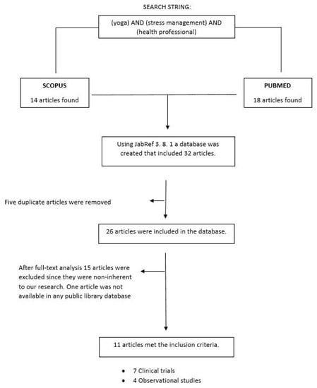 Search results found in both databases (PubMed and Scopus) were uploaded for screening into JabRef 3.8.1. A first selection was performed by filtering duplicates and subsequently, a title and abstract screening was conducted. All potentially relevant articles were then independently reviewed for full text and assessed for eligibility. Studies were included if they addressed the question of yoga used to manage stress and reduce physical pathologies in healthcare professionals. No restriction of year of publication or language was applied during the study selection. Any disagreement between the reviewers was resolved through a consensus session with a third reviewer. Figure 1 shows the flowchart of the selection of articles.