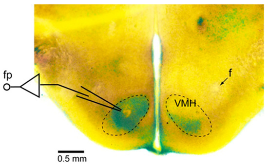 For the extracellular recordings by the field potential technique, glass electrodes (50β150 ΞΌm diameter) were placed on the bilateral VMH region of the preparation (Figure 1) [17]. Neuronal activities were recorded by an AC amplifier (MEG-5200, Nihon Kohden, Tokyo, Japan) through a 0.5-Hz low-cut filter and stored on hard-disc memory through a PowerLab system (ADInstruments, Castle Hill, Australia) with a 4 kHz sampling rate. The field potentials were rectified and integrated with a 0.5 s time constant in off-line analysis by the LabChart 7 Pro software program (version 7.3.4, ADInstruments, Castle Hill, Australia).
