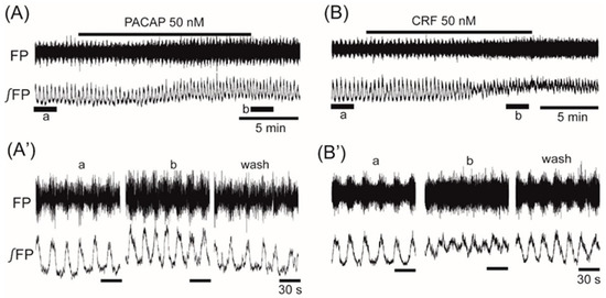 The effects of anorexigenic neuropeptides PACAP (pituitary adenylate cyclase-activating polypeptide) and corticotropin-releasing factor (CRF) on oscillation in the ventromedial hypothalamus. (A,B) Examples of continuous recordings of ventromedial hypothalamus field potential before and after the application of 50 nM PACAP and 50 nM CRF, respectively. (Aβ,Bβ) Faster sweep representations: a and b correspond to records at βaβ and βbβ in (A,B), and after 20-min washout (wash). The frequency of the oscillation was increased by the application of each of the peptides. Note that the application of PACAP or CRF also increased background tonic activity. FP: raw field potential; β«FP: integrated field potential; wash: washout.