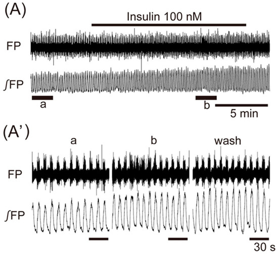 The effects of anorexigenic neuropeptide insulin on oscillation in the ventromedial hypothalamus. (A) An example of continuous recording of the ventromedial hypothalamus field potential before and after application of 100 nM insulin. (Aβ) Faster sweep representations: a and b correspond to records at βaβ and βbβ in (A), and after 20-min washout (wash). The frequency of the oscillation was increased by the application of insulin. FP: raw field potential; β«FP: integrated field potential; wash: washout.