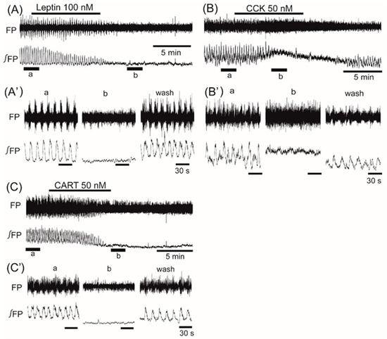Orexin, insulin, CRF, PACAP, galanin, ghrelin, NPY, CCK, and CART were supplied from the Peptide Institute, Inc. (Osaka, Japan). Leptin was supplied from Sigma Aldrich (Tokyo, Japan). The concentration of each drug was referred from previous papers [20,21,22,23,24,25,26,27,28,29]. We also tested the effects of the peptides at 10β100 nM in preliminary experiments and determined the minimum concentration that caused clear and reversible effects. All drugs were dissolved in standard ACSF and applied to the preparation for 10β15 min by superfusion. Field potential recordings were attempted from the bilateral VMH region (see below), and one preparation was tested for less than three different conditions, when the VMH activity recovered after 20β30 min washout. Thus, a total of 97 field potential recordings were examined.