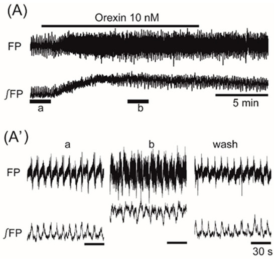 The effects of orexigenic neuropeptide orexin on oscillation in the ventromedial hypothalamus. (A) An example of continuous recording of the ventromedial hypothalamus field potential before and after the application of 10 nM orexin. (Aβ) Faster sweep representation: a and b correspond to records at βaβ and βbβ in (A), and after 20-min washout (wash). The frequency of the oscillation was increased by the application of orexin. Note that its application increased background tonic activity.