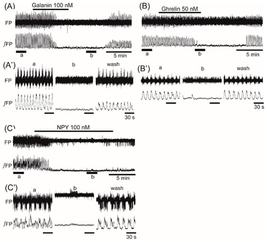 The effects of orexigenic neuropeptides galanin, ghrelin, and neuropeptide Y (NPY) on oscillation in the ventromedial hypothalamus. (AβC) Examples of continuous recordings of the ventromedial hypothalamus field potential before and after application of 100 nM galanin, 50 nM ghrelin, and 100 nM NPY, respectively. (AββCβ) Faster sweep representations: a and b correspond to records at βaβ and βbβ in (AβC), and after 20-min washout (wash). The frequency of the oscillation was inhibited by the application of each of the peptides.