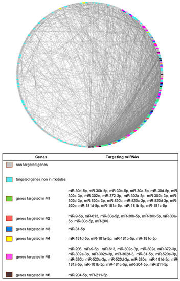 Degree Sorted Circle Layout of the Protein–Protein Interaction (PPI) network of differentially expressed genes in Systemic Sclerosis patients. Nodes are ordered around a circle based on their degree of connectivity (number of edges). Genes not targeted, genes targeted but not included in modules and genes targeted and included in the modules are differently colored.
