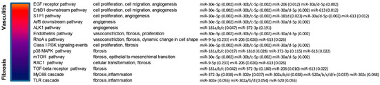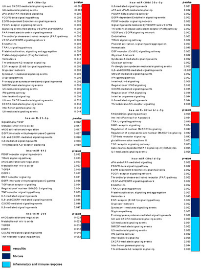 We also observed that a large proportion of the pathways enriched (p < 0.05) in modulated genes targeted by the 26 selected miRNAs were linked to the three main features of the disease (i.e., immune and inflammatory response, vasculitis and fibrosis) thus confirming their possible involvement in SSc pathogenesis. Figure 2 shows a selection of the above mentioned enriched signaling pathways in which are involved modulated genes targeted by 11 of the 26 selected miRNAs.