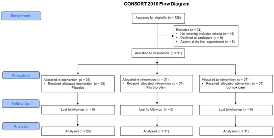 Before the start of each treatment, an operator who was not involved in the subsequent phases of the study or the data processing conducted the assignment of each sealed envelope (which contained the type of treatment and the patient’s name and date of birth) to the therapist who subsequently prescribed postoperative therapy. The same operator who performed the statistical assignment phase was blinded to all patient clinical data and to the following analysis and evaluation of the data. For the codification of the single groups, it was decided, before the study, to assign the letter ‘A’ to the placebo treatment, the letter ‘B’ to the Flurbiprofen treatment, and the letter ‘C’ to the Lornoxicam treatment. Each envelope was used for each treatment assignment. In this phase, the type of treatment for each patient, useful for the subsequent statistical analysis, was registered. The patient, clinician, surgeon, and statistician who participated in the subsequent follow-up session were all blinded to the treatment data.