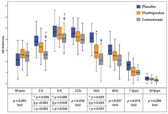 The differences between time points of the VAS score are represented in Table 3. All treatment groups presented significant differences between the eight follow-up time points (p = 0.000). More specifically, the placebo group presented VAS score significantly at every time point, excluding when the VAS score values at 2 h were compared to the values obtained at 24 h (p = 0.0049) and when the VAS score at 6 h was compared to the values at 12 h (p = 0.453). The Flurbiprofen group improved the VAS score significantly at every time point, excluding when the VAS score values at 30 min were compared to the values obtained at 24 h (p = 0.0743), 48 h (p = 0.954) and when the VAS score at 6 h was compared to the values at 12 h (p = 0.0022). The Lornoxicam group improved the VAS score significantly at every time point, excluding when the VAS score values at 30 min were compared to the values obtained at 2 h (p = 0.0730), 24 h (p = 0.0048) and at 48 h (p = 0.066), when the VAS score at 6 h was compared to the values at 12 h (p = 0.1503) and when VAS score values at 24 h were compared to the values at 48 h (p = 0.7068).