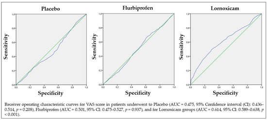 Furthermore, regarding the overall area under the curve (AUC), for the placebo, an AUC = 0.475 (Confidence Interval (CI) 95% = 0.436–0.514), p = 0.208 was obtained, which was not significant. Similarly, for Flurbiprofen an AUC = 0.501 (CI 95% = 0.475–0.527), p = 0.937 was obtained, which was not significant; for Lornoxicam, instead, a higher AUC = 0.614 (CI 95% = 0.589–0.638) with a p-value < 0.001 was obtained (Figure 3).