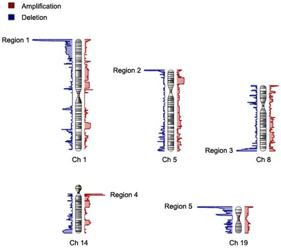 The chromosome view of genome-widely identified copy number variations including deletions and amplifications. The identified copy number variations are filtered using criteria of presence of total copy number aberration in more than 15% of the patients and minor allele frequency more than 0.15. After filtering, there are 5 significant regions (regions 1–5) in chromosome 1 (Ch 1), 5 (Ch 5), 8 (Ch 8), 14 (Ch 14) and 19 (Ch 19) in which the copy numbers are significantly different between atrial fibrillation (AF) patients with thromboembolic stroke and controls. X axis represents the number of aberration patients. Blue and red regions represent deletion and amplification, respectively.