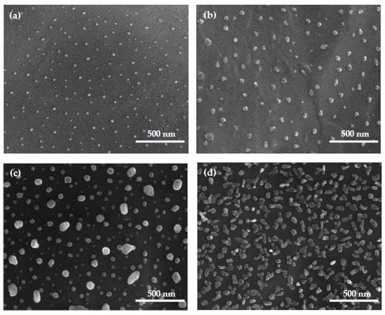 The analysis of the SEM images of Ti6Al4V substrates (Figure 1a–d), whose surfaces have been enriched with AgNPs, shows that this surface is evenly covered by dispersed silver grains, whose densities increase with the increase of the nanoparticles weight percent on the substrate surface. The diameter of the nanosilver grains ranges from 18 ± 8 nm up to 53 ± 18 nm. The smallest diameter of nanosilver is observed when 5 mg of the precursor was used. The use of 20 mg of the CVD precursor in the same deposition conditions led to the formation of AgNPs with significant differences in the diameter (from 45 up to 90 nm) and shape (from spherical to rods) of silver grains (Figure 1c). These deposition conditions are probably suitable for the nucleation of spherical grains and their later growth in one direction (formation of rods). The increase of the CVD precursor concentration in vapors (50 mg) caused the deposition of AgNPs of similar diameter and shape, but their arrangement is characterized by a significantly higher density (Figure 1d).