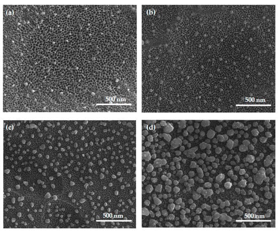 Scanning electron microscopy (SEM) images of Ti6Al4V/TNT5/0.6AgNPs; d = 38 ± 14 nm (a), Ti6Al4V/TNT5/1.0AgNPs; d = 43 ± 10 nm (b), Ti6Al4V/TNT5/1.6AgNPs; d = 57 ± 24 nm (c), Ti6Al4V/TNT5/2.3AgNPs; d = 115 ± 49 nm (d).