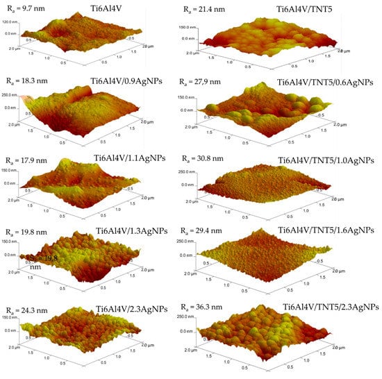 The surface roughness parameter (Ra) of the studied samples was measured in the 2 × 2 μm area using software, which is an integral part of the atomic force microscopy (AFM, Veeco (Digital Instruments), Figure 3). The values of the Ra parameters determined for Ti6Al4V and Ti6Al4V/TNT5 samples were used as reference samples. The analysis of these data revealed a significant increase of the roughness parameter value with the increase of the density and size of the AgNPs deposited on the surface of both types of substrates. Moreover, the comparison of the Ti6Al4V/TNT5/AgNPs samples and the Ti6Al4V/AgNPs ones indicate the clear influence of the nanotubular architecture on the increase of the surface roughness, e.g., the value of a Ra parameter of Ti6Al4V/TNT5/1.0AgNPs is about 42% higher than that of Ti6Al4V/1.1AgNPs.