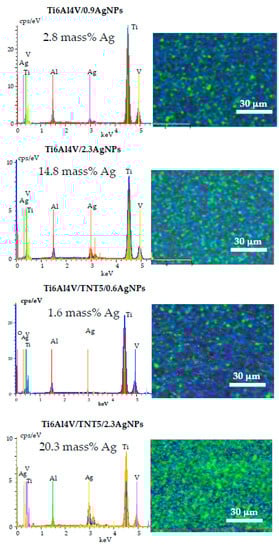 The energy dispersive X-ray spectroscopy (EDS) spectra and maps images of Ti6Al4V/0.9AgNPs, Ti6Al4V/2.3AgNPs, Ti6Al4V/TNT5/0.6AgNPs, and Ti6Al4V/TNT5/2.3AgNPs (AgNPs are marked as the green dots on the presented map images).