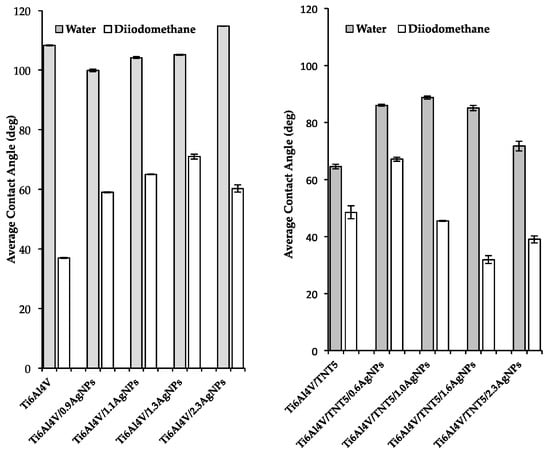 In order to estimate the value of the surface free energy based on mathematical calculations, which were performed using the Owens–Wendt method, the contact angle of two different liquids (one of them, polar, and the other one, dispersional) had to be used in the analyses []. Therefore, polar water and dispersional diiodomethane were chosen as measuring liquids. The obtained contact angles measurements results, as well as the calculated SFE values, are presented in Figure 5 and Figure 6 and in Table S1. According to these data, the hydrophobic character of the Ti6Al4V surface slightly decreases after depositing small amounts of AgNPs (0.9 wt%), however, with the increase of their density, the coatings’ hydrophobicity increases (Figure 5, Table S1). The fabrication of the titania nanotubes layer on the surface of Ti6Al4V leads to the formation of a hydrophilic surface, which becomes more hydrophobic when it is enriched with silver nanoparticles (Figure 5, Table S1).