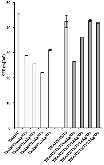 The values of the surface free energy (SFE) decreases for all Ti6Al4V/AgNPs samples in comparison to the adequate value for pure Ti6Al4V sample (Figure 6, Table S1). For the sample Ti6Al4V/1.3AgNPs, this is more than two times lower. A different situation is noticed for the Ti6Al4V/TNT and Ti6Al4V/TNT/AgNPs samples. Here, with the exception of the first two silver-enriched systems (Ti6Al4V/TNT/0.6AgNPs and Ti6Al4V/TNT/1.0AgNPs) for which the SFE values are lower than for Ti6Al4V/TNT, two consecutive ones, i.e., Ti6Al4V/TNT/1.6AgNPs and Ti6Al4V/TNT/2.3AgNPs, are characterized by a similar value of free surface energy (Figure 6, Table S1).