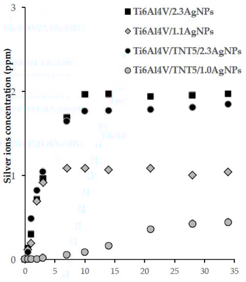 The release amount of Ag+ ions from Ti6Al4V/AgNPs and Ti6Al4V/TNT5/AgNPs samples (containing 2.3 and 1.0–1.1 wt% of AgNPs) immersed in a phosphate buffered saline (PBS) and measured by inductively coupled plasma ionization mass spectrometry (ICP-MS).