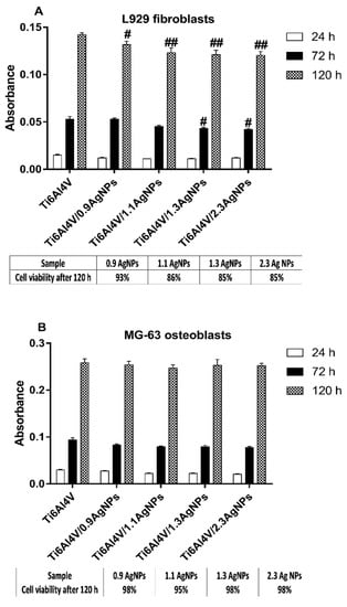 The L929 murine fibroblasts (A) and human osteoblasts MG-63 (B) adhesion (measured after 24 h) and proliferation (evaluated after 72 h and 120 h) on the surface of Ti6Al4V/AgNPs, detected by the MTT (3-(4,5-dimethylthiazol-2-yl)-2,5-diphenyltetrazolium bromide) assay. The absorbance values are expressed as means ± SEM of five independent experiments. Hash marks indicate significant differences at the appropriate incubation time between the cells incubated on the reference Ti6Al4V alloy foils (Ti6Al4V) compared to the specimen coatings doped by the different concentrations of Ag (# p < 0.05, ## p < 0.01). Tables below Figure 8A,B presented relative L929 cells or MG-63 cell viability (%) compared to the Ti6Al4V reference sample measured after 120 h of incubation.
