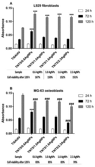 This phenomenon was also observed after 72 h of incubation, but only for the samples enriched with 0.6 wt% of AgNPs (p < 0.001, Ti6Al4V/TNT5/0.6AgNPs). On the other hand, MG-63 osteoblasts cultured on the TNT5 nanotubes enriched with silver nanoparticles provoked a decrease in the level proliferation of MG-63 osteoblasts after 120 h of incubation (p < 0.001) in comparison to the Ti6Al4V reference alloy (p < 0.001) (the relative MG-63 cells viability compared to the Ti6Al4V reference sample and expressed as a percentage was presented in the Table below the Figure 9B). However, it should be clearly emphasized that these samples also showed an increase in the level of proliferation over time.