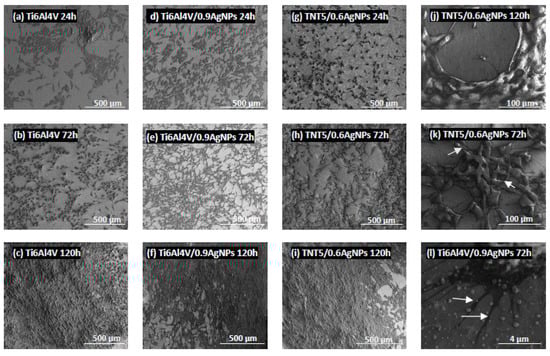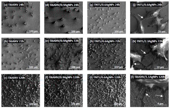 Biointegration of titania nanolayers enriched with silver nanoparticles were also assessed by the analysis of SEM micrographs. Comparative SEM images showing the morphology, adhesion and proliferation of the cells growing on the surface of Ti6Al4V alloy and Ti6Al4V/AgNPs, as well as on Ti6Al4V/TNT5/AgNPs, are presented in Figure 10 and Figure 11, respectively. These data clearly demonstrate the high biocompatibility of both types of tested nanolayers, supporting the results from the MTT assay. As it can be seen, L929 fibroblasts cultured on the surface of Ti6Al4V/AgNPs, as well as on the surface of Ti6Al4V/TNT5/AgNPs, showed the increase in cell proliferation over time (compare micrographs in Figure 10d–i). A similar phenomenon was also observed for the MG-63 osteoblasts (compare micrographs in Figure 11d–i). Importantly, the cells, especially MG-63 osteoblasts, start to grow in layers on top of each other (Figure 11k), and moreover, the cells grow with a multilayer structure on most of the surfaces of the nanolayers after 120 h of incubation time (see micrographs in Figure 11f,i,j). Finally, the SEM images also show that L929 fibroblasts, as well as MG-63 osteoblasts, form numerous filopodia which attach the cells to the surface of specimens by penetrating deep into the nanolayers (arrows in Figure 10l and Figure 11l, respectively). These thin, actin-rich plasma-membrane protrusions were also generated between the cells (arrows in Figure 10j–k and Figure 11k, respectively).
