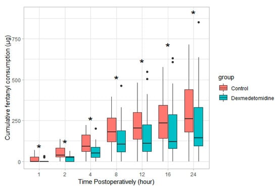 Figure 2. Cumulative fentanyl consumption over time in both groups. Data are expressed as median (interquartile range). * p < 0.05. ● outlier (any data point more than 1.5 interquartile ranges below the first quartile or above the third quartile).