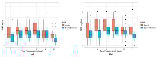 Postoperative cumulative fentanyl consumption at 24 h was significantly lower in the dexmedetomidine group than in the control group (122.6 (IQR, 94.5–268.0) μg vs. 348.1 (IQR, 192.8–459.2) μg, p = 0.001), with a Hodges–Lehman median difference of 86.2 (95% confidence interval (CI), 4.2–156.4) mg between groups. The number of patients requiring analgesics in the PACU was significantly lower in the dexmedetomidine group than in the control group (12.1% vs. 42.4%, p = 0.013; relative risk (95% CI) = 0.368 (0.15–0.899)). The difference in opioid consumption, which began during the early postoperative period, continued over the entire 24 h postoperative period (Figure 2). NRS pain score for coughing was lower in the dexmedetomidine group at postoperative 2, 4, 8, and 24 h. However, NRS pain score for resting was not significantly different at any point postoperatively, other than at 4 h (Figure 3). Maximum NRS pain scores for both resting and coughing over 24 h were significantly lower in the dexmedetomidine group (Table 2).