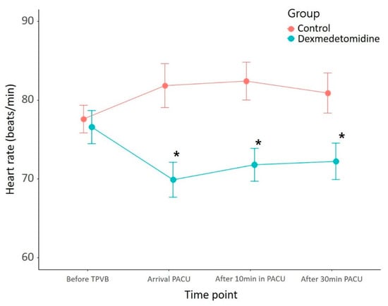 Figure 4. Changes in heart rate over time in the post-anesthesia care unit. The changes over time differed significantly in the two groups (p = 0.002). * p < 0.013 using Bonferroni’s correction for multiple comparisons. PACU: post-anesthesia care unit; TPVB: thoracic paravertebral block.
