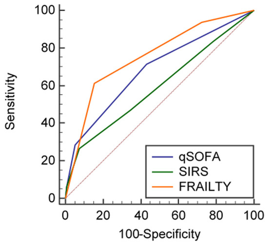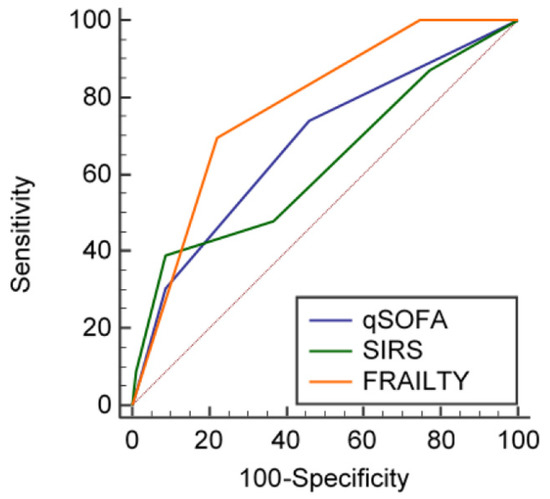Receiver Operating Characteristic (ROC) curves showing the predictive capacity of qSOFA, SIRS, and frailty (operationalized according to the Rockwood Clinical Frailty Scale) for pooled three-month mortality in the studied geriatric population.