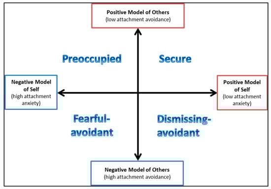 Based on their dominant response patterns, adults can be classified into one of four attachment styles—one secure style, and the three insecure styles: dismissing, preoccupied, and fearful [12,13] (see Figure 1). Attachment can also be operationalized as dimensions, with low scores on both attachment anxiety and avoidance representing secure attachment, and high scores in either attachment anxiety or avoidance (or both) representing insecure attachment [14].