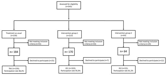 Of the 545 patients attending the Heidelberg Orthopedic Hospital, University Clinic Heidelberg, between March 2012 and January 2016, 127 patients did not meet the inclusion criteria to be treated in the clinic (see below) and another 44 patients declined to participate. Therefore, a total of 374 (68.6%) were recruited to this study. As seen in the flow chart in Figure 2, 159 of these participants were assigned to the TAU group, 163 to the IG1 group, and 52 to the IG2 group. Table 1 displays descriptive details for the demographic variables of the patient population.