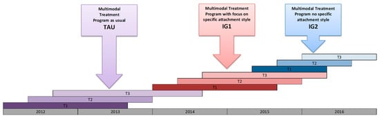 The only difference between the IG1 and IG2 interventions was that, in IG1 only, weekly team meetings incorporated case reviews with discussion regarding the attachment diagnostics (i.e., individual attachment styles) of each patient. The IG2 group also had weekly team meetings, but the clinicians were not informed about the specific attachment style of each patient. Instead, it was expected that after receiving the attachment-based training sessions, the team would be more sensitive to the individual attachment behavior of patients without knowing the specific attachment style.