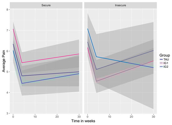 Concerning Hypothesis 1, the conditional model including average pain as the outcome variable showed no difference between either IG1 or IG2 to TAU at post-treatment (see Figure 4) but a significant difference at 6-month follow-up in average pain for IG1 compared to IG2 (γ01 = −0.92, SE = 0.45, t(358) = −2.027, p < 0.05), in favor of IG2 (see Table 4). Additionally, IG2 worked markedly better in the long run for patients with high attachment anxiety (see Figure 4). While having significantly worse pain intensity scores in IG2 after treatment compared to TAU and IG1 (γ03 = −0.52, SE = 0.22, t(358) = 2.32, p < 0.05), patients with high attachment anxiety achieved the lowest scores of pain at follow-up (γ23 = −0.02, SE = 0.01, t(358) = −1.78, p = 0.08), although this effect did not reach significance.