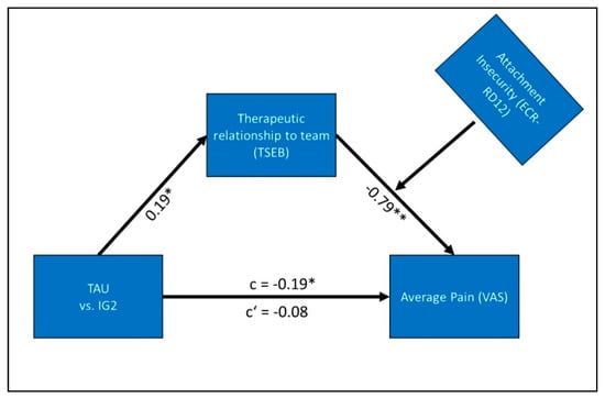 In summary, the mediation analysis indicated a difference in pain reduction between IG2 and TAU that is mediated by working alliance, measured by the TSEB. This effect, in turn, is dependent on attachment insecurity, as shown in Figure 6. High values of attachment insecurity negate the positive effect of the working alliance, while low values reinforce it. This moderating effect extends to both the average level of pain at follow-up (−1 SD ECR-RD12 Insecurity B = −0.11, SE = 0.7; +1 SD ECR-RD12 Insecurity B = 0.01, SE = 0.03), and rate of change during therapy (−1 SD ECR-RD12 Insecurity B = −0.0012, SE = 0.0008; +1 SD ECR Insecurity B = 0.0001, SE = 0.0003).