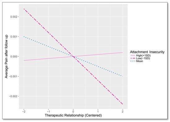Moderated effect of attachment insecurity on the relationship between working alliance and average pain after follow up.