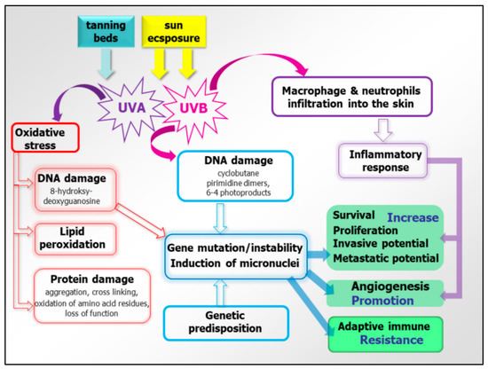 Molecular background of UV radiation and oxidative stress for the melanoma cause. Both sun exposure and tanning beds are sources of UV. Among them, UVA is mostly responsible for oxidative stress, causing DNA and protein damage as well as lipid peroxidation. DNA damage leads to gene instability and mutagenesis, impacting the main cellular processes involved in cancerogenesis, cancer growth, metastasis, and adaptive immune resistance. Likewise, UVB modulate those processes by the activation of inflammatory response.