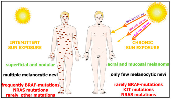 Differential dependence of melanoma subgroups on sun exposure and types of gene mutations. The interplay of genetic and environmental factors on melanoma development. Up to 50% of melanomas derived from the skin without chronic sun damage (intermittently exposed to UV) contain BRAF mutations. The second frequent mutations are present in the NRAS gene (around 25%). In melanomas derived from chronic sun exposure, NRAS and KIT mutations are more common (~15% and ~20%) than BRAF (~10%). According to Janina Staub (2012) with some modifications [30,31].