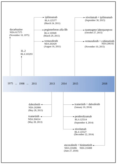 The Food and Drug Administration (FDA) approvals for melanoma drugs timeline [35].
