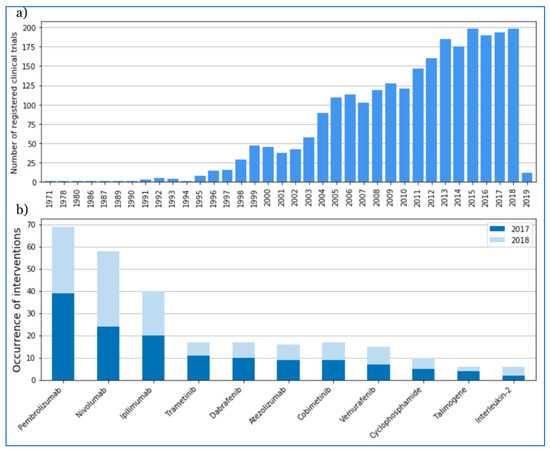 Number of trials starting each year from 1971 to 2019 based on International Clinical Trials Registry Platform (ICTRP) data (a). Most frequently mentioned melanoma interventions in the ICTRP database in 2017 and 2018 (b).