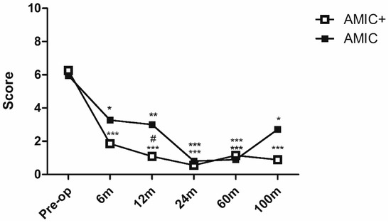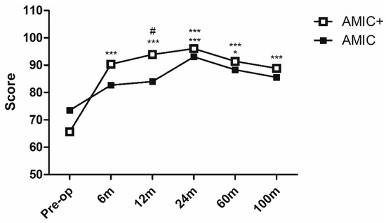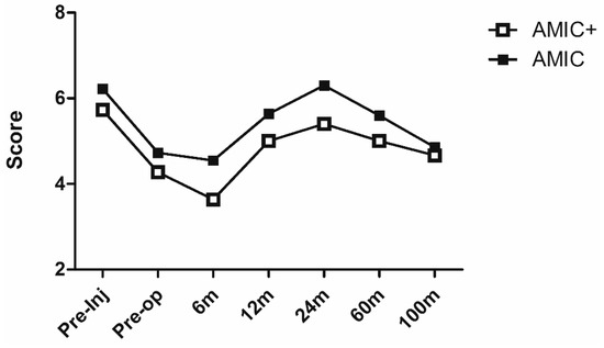 | 100 months | 85.6 ± 9.4 (73–100) | 89.1 ± 6.0 (80–100) | AMIC 7; AMIC+ 9 | 2.7 ± 2.8 (0–8) | 0.9 ± 1.1 (0–3) | AMIC 7; AMIC+ 9 | 4.9 ± 2.5 (1–8) | 4.7 ± 1.3 (3–7) | AMIC 7; AMIC+ 9 |