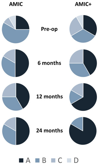 | 6 months | 84.2 ± 10.6 (64–100) | 90.4 ± 6.6 (80–100) | AMIC 12; AMIC+ 11 | 3.3 ± 1.8 (0–7) | 1.9 ± 1.4 (0–8) | AMIC 12; AMIC+ 11 | 4.5 ± 2.0 (3–9) | 3.6 ± 0.9 (2–5) | AMIC 11; AMIC+ 11 |