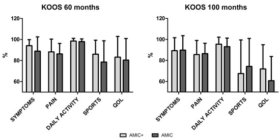 | 60 months | 88.3 ± 9.6 (70–100) | 91.4 ± 7.2 (76–100) | AMIC 10; AMIC+ 10 | 0.9 ± 1.4 (0–4) | 1.2 ± 1.3 (0–4) | AMIC 10; AMIC+ 10 | 5.6 ± 1.4 (3–7) | 5.0 ± 2.2 (2–9) | AMIC 10; AMIC+ 10 |