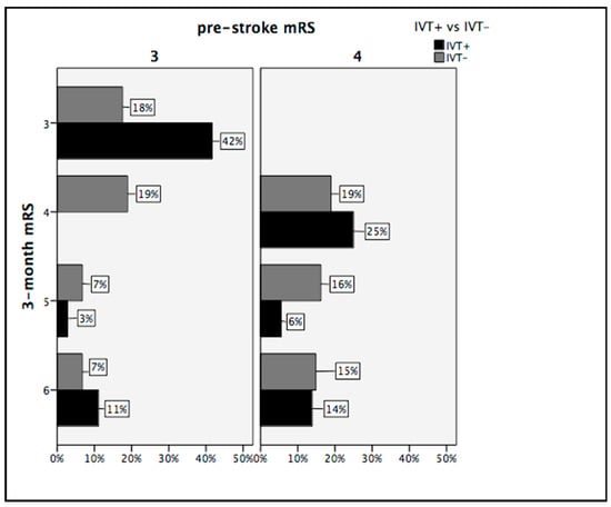 Figure 1 shows the distribution of mRS scores at admission and three months after the stroke according to IVT treatment.