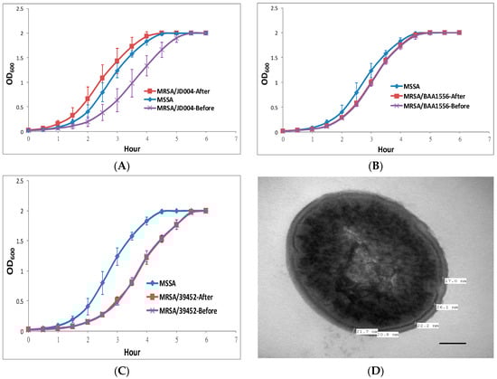In order to characterize drug-sensitivity gene alteration in these three strains, multiplex PCR was performed for mec gene-complex genotyping. MRSA/JD004 and MRSA/JD39452 belonged to Class A, while BAA-1556 belonged to Class B (Figure S2) [39].