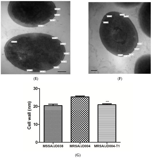 Cell-wall thickness is one of the critical factors in drug resistance [40,41,42]. Cell-wall thickness was measured using TEM after ICG-PDT. The average thickness of the MRSA/JD004 cell wall was reduced from 25.3 ± 1 to 20.9 ± 1 nm (17.4% reduction, *** p < 0.001, Bonferroni t-method), which was similar to MSSA cell-wall thickness (Figure 1G).
