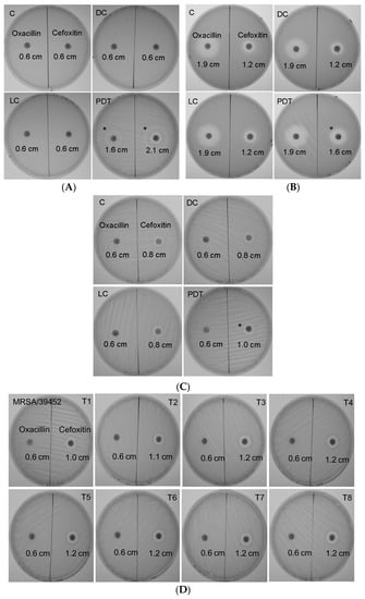 Alterations in MRSA drug sensitivity after ICG-PDT. (A) MRSA/JD004, (B) MRSA/BAA-1556, and (C) MRSA/39452 were incubated with 25 µg/mL of ICG and exposed to 100 J/cm2 near-infrared at 65.5 mW/cm2; (D) MRSA/39452 was treated repeatedly with ICG-PDT up to eight times. The clear zones were created by MRSA growth inhibition by antibiotic in the disks. (A) In MRSA/JD004, the oxacillin inhibition zone increased from 0.6 to 1.6 cm after PDT (166.7% increment), and the cefoxitin inhibition zone increased from 0.6 to 2.1 cm (250% increment). (B) The oxacillin clear zone did not change in MRSA/BAA-1556, but the cefoxitin clear zone increased from 1.2 to 1.6 cm (33% increment, Figure 2B) after PDT. (C) In MRSA/39452, there was a small increase in the cefoxitin inhibition zone (0.8 to 1.0 cm; 25% increment) and no change in the oxacillin inhibition zone. (D) In MRSA/39452, the oxacillin diameter did not change after two more repeated treatments, yet the cefoxitin inhibition zone further increased by 20%. The changes of the drug-sensitivity phenotype were maintained until the eighth repeated PDT. T1–T8: number indicates the number of times exposed to PDT. MRSA that survived from the previous PDT treatment were used for the subsequent treatment. The above are representative data of three separate experiments. C: absolute control; DC: dark control; LC: light control; PDT: photodynamic therapy. * sensitive to oxacillin.