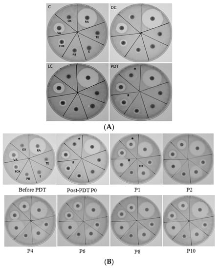 The disk-diffusion method and minimum-inhibitory-concentration (MIC) determination were used to measure antimicrobial susceptibility [26]. According to the guidelines of the Clinical and Laboratory Standards Institute (CLSI, Table S1), disks (OxoidTM Disc, Thermo Fisher Scientific Inc., Waltham, MA, USA) containing 1 µg oxacillin (OX), 30 µg cefoxitin (FOX), 30 µg vancomycin (VA), 5 µg rifampin (RA), 30 µg tetracycline (TE), 15 µg erythromycin (E), and 300 units polymyxin B (PB) were placed on an MH agar plate prespread with bacteria with a McFarland turbidity of 0.5 (1 × 108 CFU/mL MRSA, collected from different treatments as described above). The diameter of each inhibition zone was measured after 18 h of incubation at 37 °C. The larger the diameter, the more sensitive the bacteria are to the antibiotic in the disk.