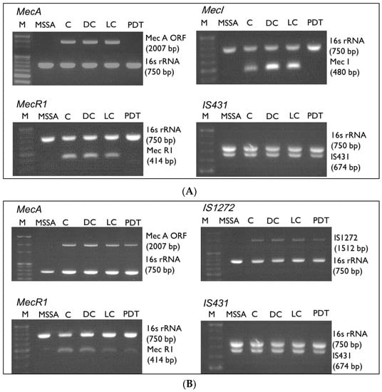 - Weller, T.M. The distribution of mecA, mecR1 and mecI and sequence analysis of mecI and the mec promoter region in staphylococci expressing resistance to methicillin. J. Antimicrob. Chemother. 1999, 43, 15–22. [Google Scholar] [CrossRef] [PubMed]