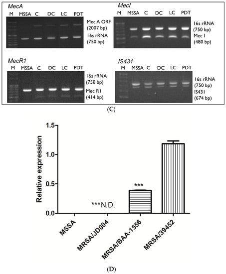 To determine whether antibiotic-resistance genes were altered by ICG-PDT, PCR was performed to identify the presence of the mec gene complex in the tested strains (Figure 4). All mec complexes except for IS431 were deleted in MRSA/JD004 (Figure 4A) after ICG-PDT. No alteration was observed in BAA-1556 (Figure 4B) and MRSA/JD39452 (Figure 4C). These changes were further quantified by qRT-PCR (Figure 4D) of the mecA gene. After ICG-PDT, no mecA expression was detected in MRSA/JD004. Interestingly, mecA gene expression decreased in BAA-1556 (0.387-fold change, (mecA gene-expression level after ICG-PDT)/(expression level prior to ICG-PDT), ***p < 0.001, Bonferroni t method). There were no significant changes in MRSA/JD39452 (p > 0.05).
