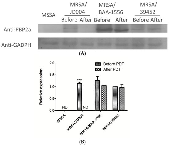 PBP2a protein expression in three MRSA strains after ICG-PDT. (A) After treatment, no protein expression was detected in MRSA/JD004. (B) 16.9% reduction in protein expression was detected in MRSA/BAA-1556, and 3.5% reduction in MRSA/39452. Each bar is the mean of two determinations ± standard deviation. Data were based on the average of three separate experiments, *** p < 0.001, paired Student t-test (PBP2a expression level after ICG-PDT/expression level prior to ICG-PDT).